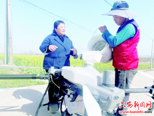 2024年3月24日,冯晓霞(左一)在霍邱县曹庙镇曹庙村现场指导农民做好油菜菌核病防治及喷硼工作,并讲解植保无人机飞防作业注意事项。(资料图)
