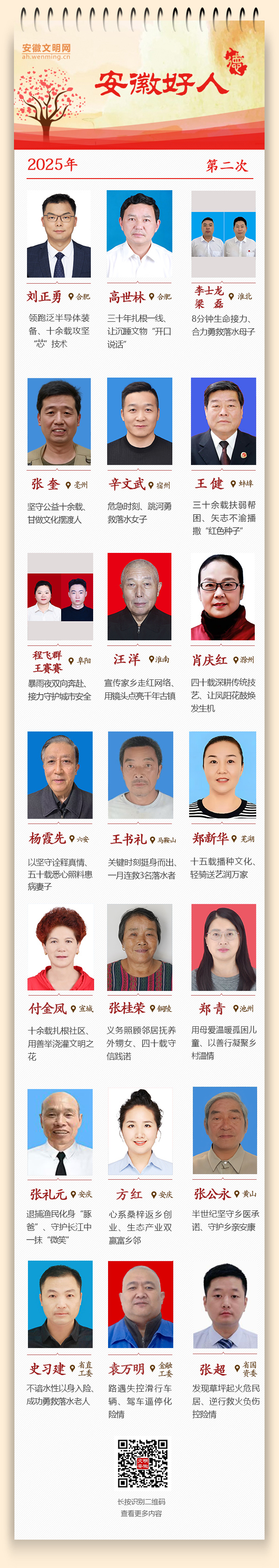 他们是:领跑泛半导体装备、十余载攻坚“芯”技术的合肥欣奕华智能机器股份有限公司首席技术官;三十年扎根一线、让沉睡文物“开口说话”的基层文化守护者合肥市肥西县柿树岗乡经济发展办公室副主任;8分钟生命接力、合力勇救落水母子的安徽省淮北矿业(集团)有限责任公司青东煤矿保运一区机电工;坚守公益十余载、甘做文化摆渡人的“书香使者”亳州市蒙城县城关街道黄海社区居民;危急时刻、跳河勇救落水女子的宿州市埇桥区曹村镇陈疃村村民;三十余载扶弱帮困、矢志不渝播撒“红色种子”的蚌埠市固镇县人民检察院退休干部;暴雨夜双向奔赴、接力守护城市安全的阜阳市颍东区和谐佳苑小区居民、阜阳市颍东区杨楼孜镇王屯村村民;宣传家乡走红网络、用镜头点亮千年古镇的银发主播淮南市寿县正阳关镇退休教师;四十载深耕传统技艺、让凤阳花鼓焕发生机的“鼓韵行者”滁州市凤阳县文化馆副研究馆员;以坚守诠释真情、五十载悉心照料患病妻子的六安市霍邱县城关镇五岳社区居民;关键时刻挺身而出、一月连救3名落水者的马鞍山市花山区濮塘镇濮塘村村民;十五载播种文化、轻骑送艺润万家的芜湖市湾沚区湾沚镇综合文化站退休人员;十余载扎根社区、用善举浇灌文明之花的宣城市宣州区鳌峰街道城南社区居民;义务照顾邻居抚养外甥女、四十载守信践诺的铜陵市郊区陈瑶湖镇前河村村民;用母爱温暖孤困儿童、以善行凝聚乡村温情的爱心妈妈池州市青阳县杜村乡五阳村村民;退捕渔民化身“豚爸”、守护长江中一抹“微笑”的安庆市西江江豚迁地保护中心管护队队长;心系桑梓返乡创业、生态产业双赢富乡邻的安徽红方工艺品有限公司总经理;半世纪坚守乡医承诺、守护乡亲安康的“健康守门人”黄山市歙县街口镇街口村村医;不谙水性以身入险、成功勇救落水老人的安徽省农业农村厅一级主任科员;路遇失控滑行车辆、驾车逼停化险情的安徽合力股份有限公司大装事业部叉车工;发现草坪起火危民居、逆行救火负伤控险情的铜陵农商银行法律事务与合规管理部兼人力资源部总经理。