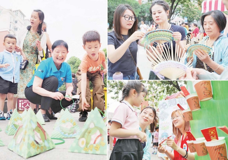 5月27日,金安区东市街道军民社区新时代文明实践站开展“粽情端午 乐享游园”首届“近邻里”文化节活动,以“一老一小”为主体,采取“端午传统文化 ”的方式,让居民通过游园参与趣味套粽子(左图)、五彩绳编织、蒲扇和香囊制作(右上图)、投壶、端午知识竞答(右下图)等传统文化体验,打卡学习垃圾分类、文明养犬、反诈骗、防溺水常识,旨在打造多元化邻里活动,营造浓厚节日氛围,引导居民在趣味互动体验中体味传统文化,促进邻里交流,增强社区凝聚力。(记者 田凯平 摄)