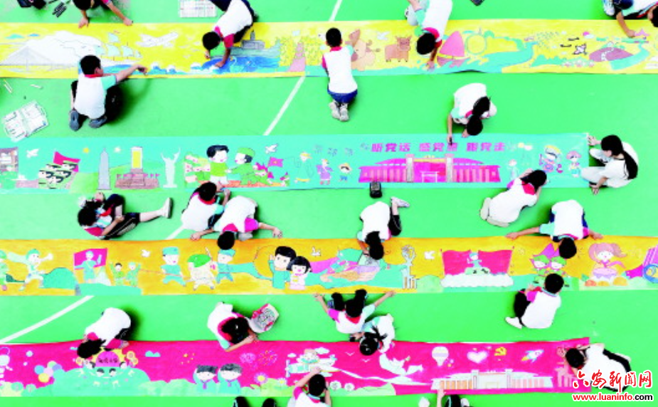“七一”前夕,六安市清水河第二小学开展“童心永向党 共绘新时代”长卷绘画活动,少先队员们在40米长卷上以纪念抗战、科技强国、民族团结、美丽家乡等为主题进行创作,绘出对党、对祖国、对家乡的热爱和祝福,展现新时代少年儿童朝气蓬勃、向上向善、积极奋发、勇于追梦的崭新风貌,激发大家发奋学习、报效祖国、永跟党走的坚定信念。