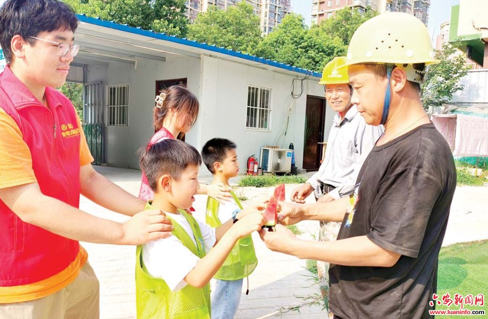 7月10日,金安区三里桥街道金裕社区工会、金裕社区团支部组织大学生志愿者与辖区儿童,走进在建工地开展“夏日送清凉”活动,为奋战在高温一线的建筑工人送去西瓜、矿泉水等防暑物资及真挚关怀。