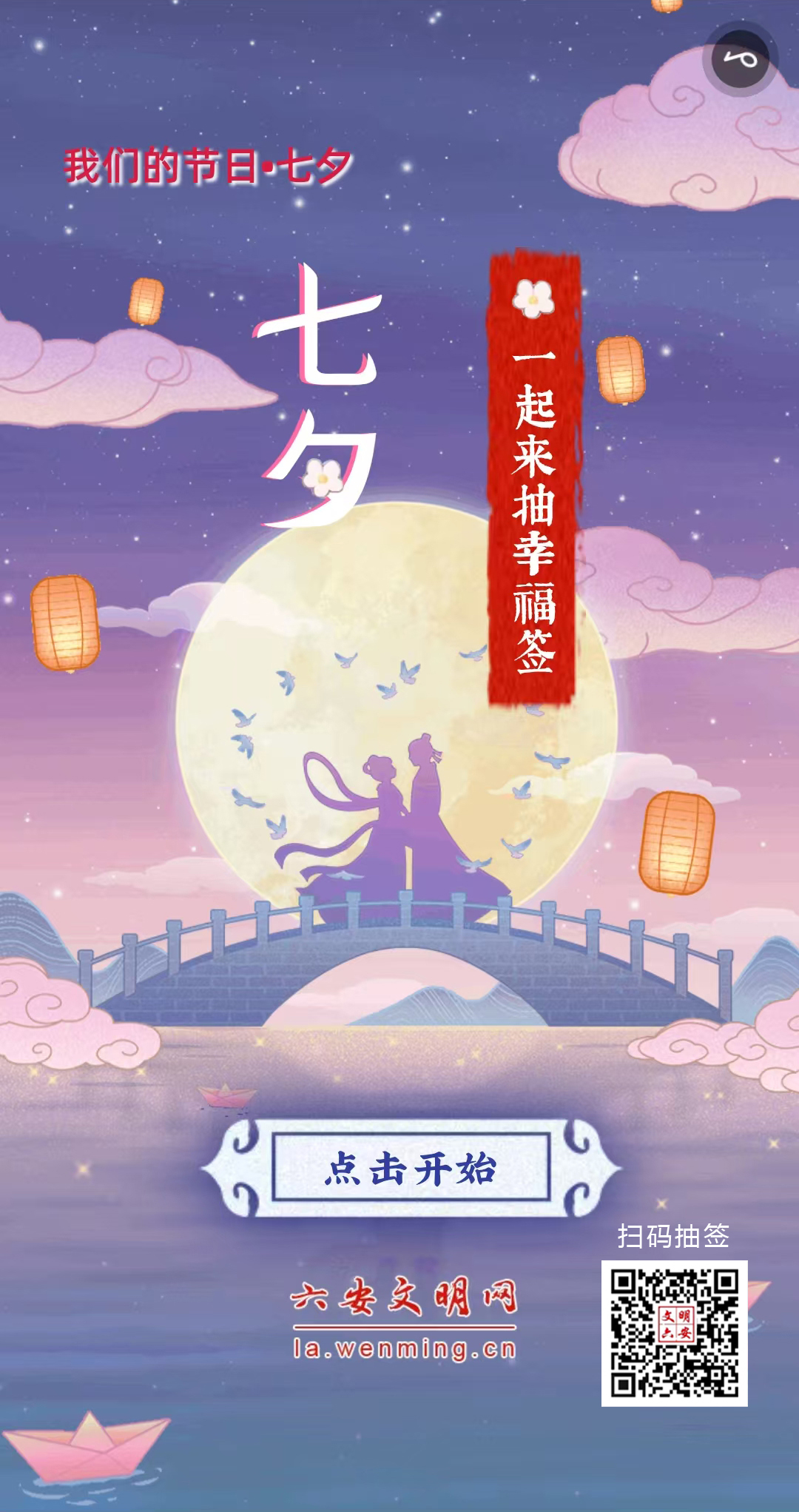 为传承中华优秀传统文化,七夕来临之际,六安文明网邀请您参与“我们的节日·七夕” 网络文明传播活动。一起抽取幸福签,学习传统文化,倡导移风易俗。扫描下方二维码进入h5互动页面,点击抽签获取您的专属幸福箴言,分享到朋友圈,传播文明新风。