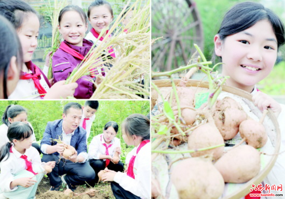 左下图:淠河小学的老师在学校“早竹园”劳动实践基地带领同学们挖红薯,讲解“一粥一饭、来之不易”的道理。