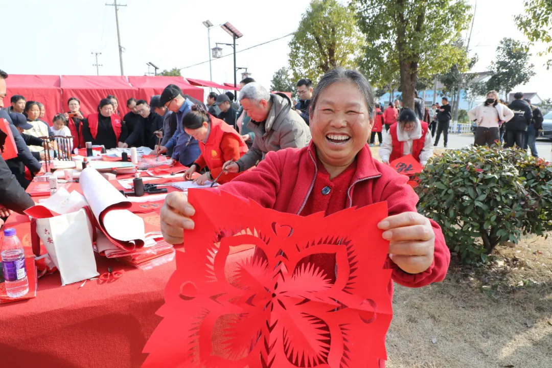 随着春节临近,活动现场设置的民俗互动体验区格外受欢迎。书法志愿者们铺纸挥毫,将美好的新春祝福凝于笔端,一副副春联和“福”字墨迹未干,便被村民欣然领取,洋溢着喜庆祥和的节日氛围。