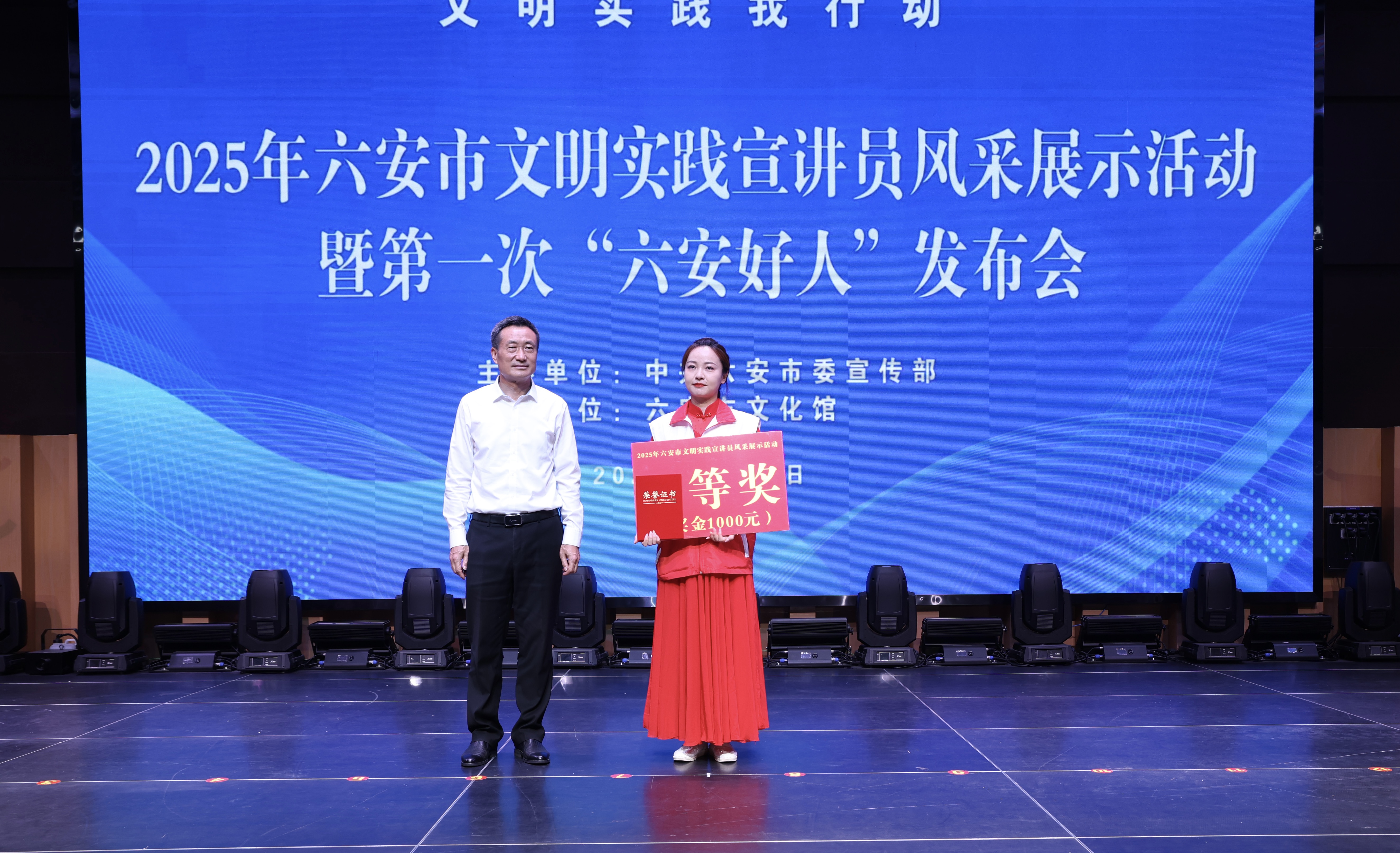 为全面展示六安市文明实践宣讲员的卓越风采,大力弘扬好人精神,进一步推动全市精神文明建设迈向新高度。5月16日,六安市成功举办2025年六安市文明实践宣讲员风采展示活动暨第一次“六安好人”发布会。市委常委、统战部部长关传兵为获奖选手颁奖。