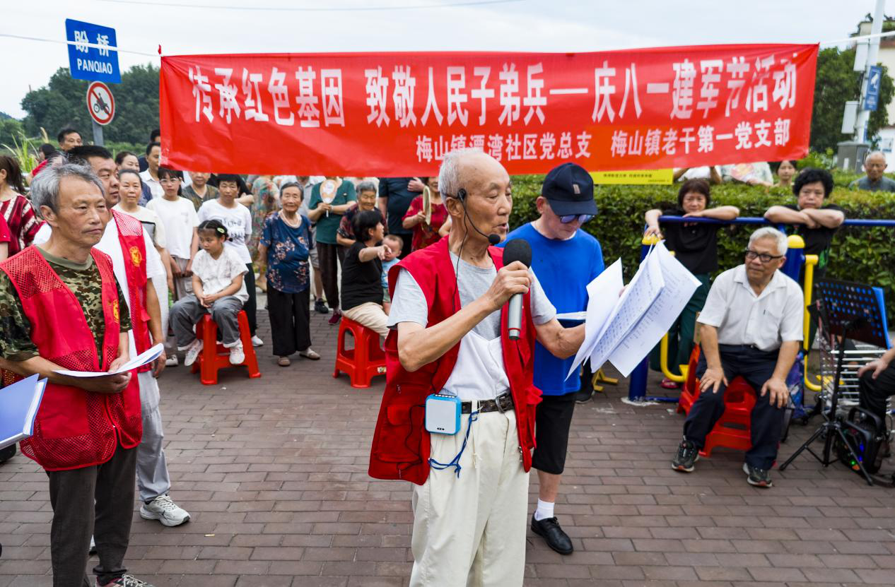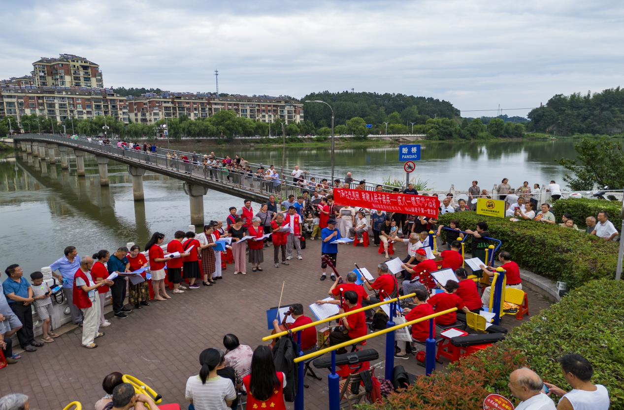 7月31日晚6点30分,金寨县梅山镇潭湾社区党总支、梅山镇便民服务中心红色文艺轻骑兵志愿服务队在盼桥头小广场举办“传承红色基因 致敬人民子弟兵”建军节主题活动。镇红色文艺轻骑兵志愿服务队现场伴奏,百余名党员群众齐唱《中国人民解放军进行曲》《没有共产党就没有新中国》等经典红歌,嘹亮歌声引来锻炼的居民自发加入。