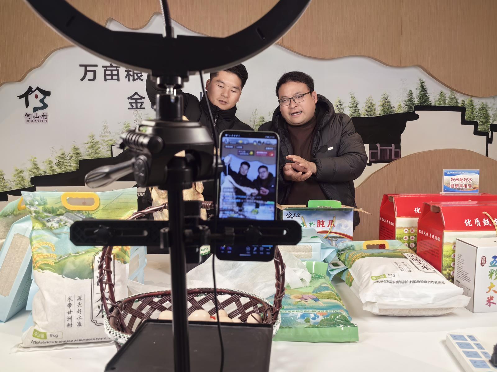 “家人们看这米,颗粒饱满,煮饭特别香!”初春午后,六安市金安区东桥镇何山村党群服务中心的“和美乡村直播间”里,六岗村党支部书记陈孝兵捧着村里产的再生稻米,向网友推介。直播间外,何山村党总支书记李绪国与罗老庄村党支部书记罗春正在低声交流,下一场,罗春将在这里推介他们村的皖西白鹅。