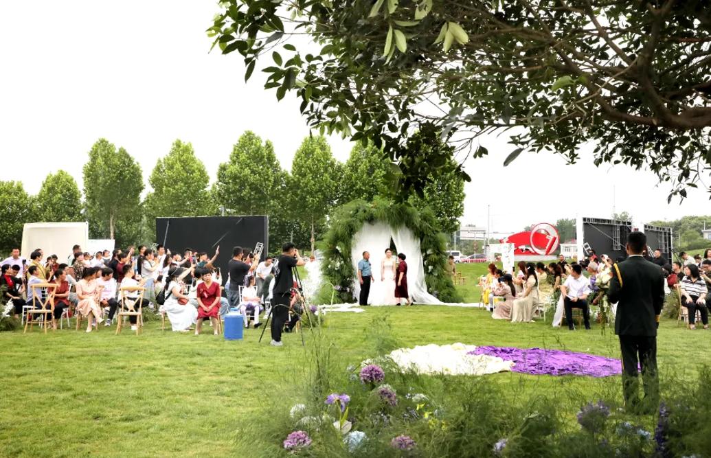 5月14日,金安区毛坦厂镇八角塘村“新风堂”前,一场绿茵草坪婚礼浪漫启幕。这场婚礼没有奢华排场,在保留仪式感的同时满载温馨幸福,赢得前来贺喜的村民连连点赞:“既新颖又有意义!”